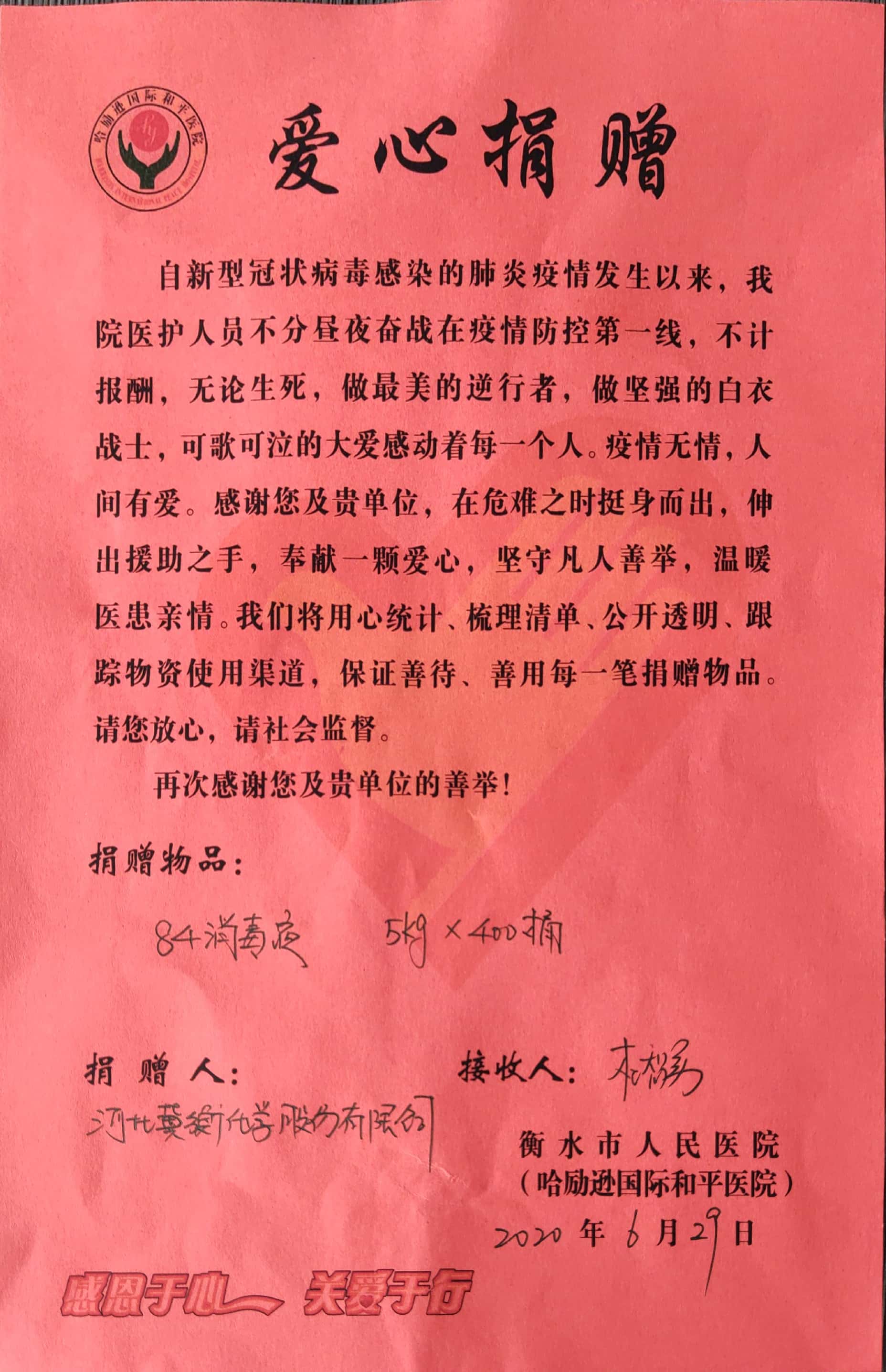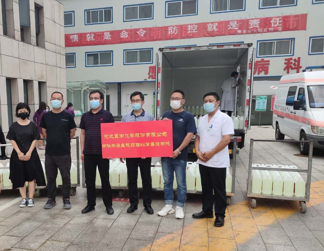 6月29日上午,公司宋英健副總經(jīng)理一行來到衡水市人民醫(yī)院,代表我公司向人民醫(yī)院捐贈84消毒液兩噸,人民醫(yī)院有關(guān)領(lǐng)導(dǎo)接受了捐贈,并對我公司表示感謝。宋總表示,作為河北省防疫物資重點生產(chǎn)企業(yè),我公司將繼續(xù)關(guān)注疫情發(fā)展,繼續(xù)助力疫情防控,相信在全社會的共同努力下,我們一定能夠戰(zhàn)勝病毒,取得新冠病毒疫情阻擊戰(zhàn)的勝利。