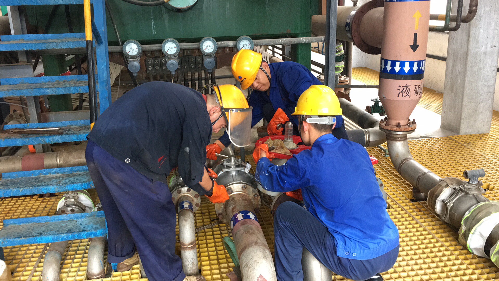 一車間重點要抓好設備的安全運行和冷卻降溫工作,確保年度大修前系統的穩定運行,車間適時調整優化生產負荷,平衡各個電解槽工藝指標的正常運行,對出現的設備問題及時進行處理。在一車間新系統廠房內,電槽所產生的熱浪導致廠房內異常悶熱,就像一個蒸籠,班長楊春生、操作工孫留鵬、機修工石磊三人為了處理一處漏點,進入廠房不到幾分鐘,汗水就會完全浸濕工作服,但他們對高溫絲毫不在乎,較好地對問題進行了處理,保證了電槽的正常運行(圖一)。