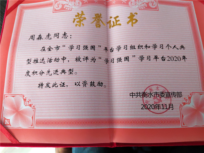 “‘學習強國’這個學習平臺,內容權威、內涵豐富、特色鮮明,我覺得受益匪淺,已經‘上癮了’!”化學公司一車間副主任周森虎表示,從剛開始的閱讀文章、觀看視頻、答題到對平臺深入了解之后的上癮、依賴,現在“學習強國”已經成了他每天的必修科目,到目前他個人累積學分已達到32864分,被衡水市委組織部授予“學習強國”學習平臺2020年度積分先進典型。